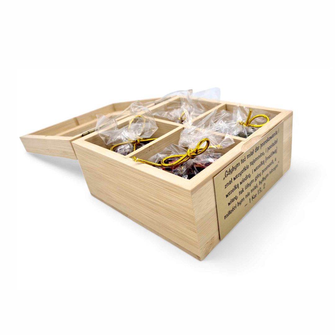 Bambusowe pudełko na herbatę ze szklaną pokrywką. Bambus jest produktem naturalnym. Dodatkowo tabliczka z cytatem biblijnym