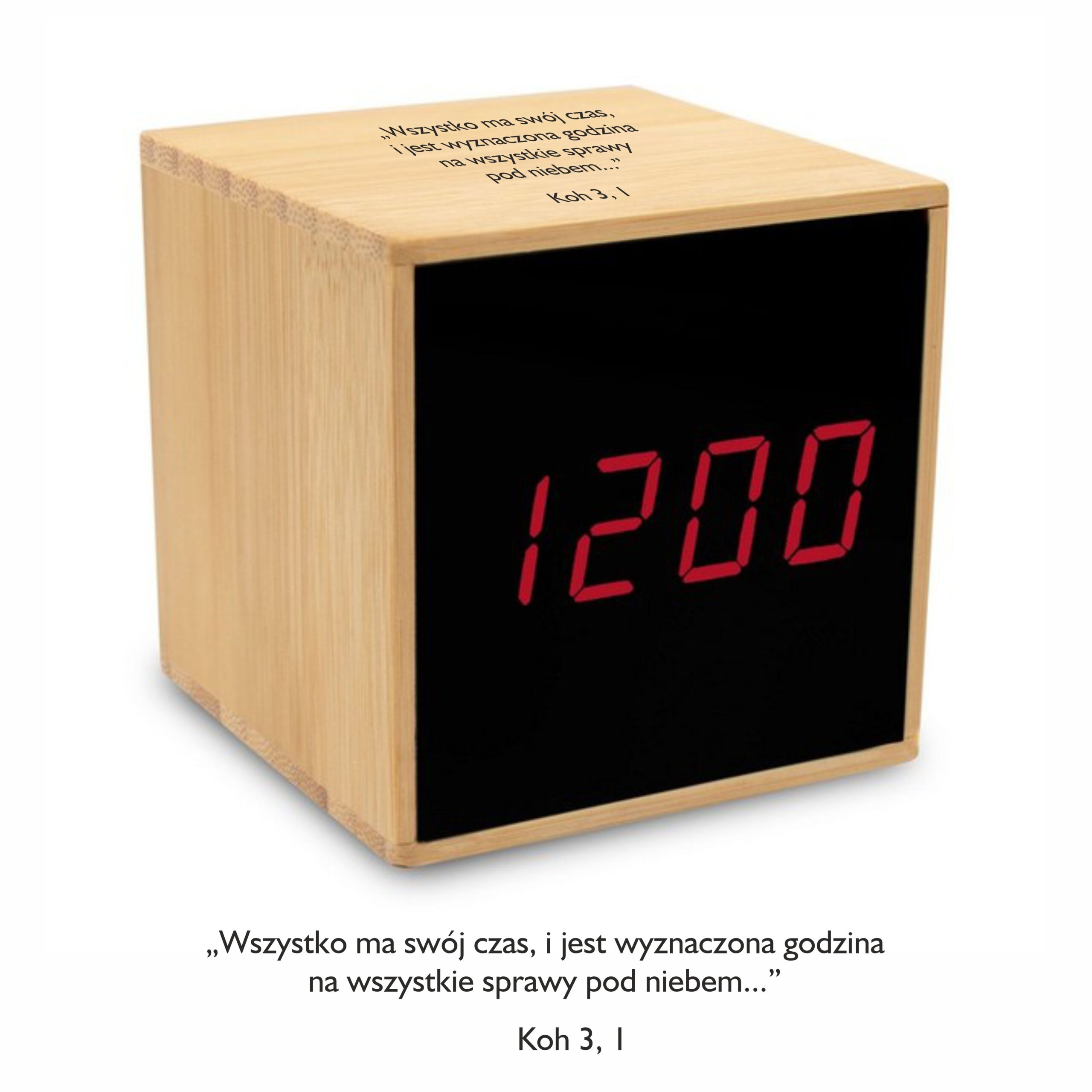 Bambusowy zegar na biurko, wyświetlacz LCD, zasilany przez kabel (w komplecie) 5V 500 mA, alternatywne źródło zasilania: 3 baterie AAA (nie są dołączone), możliwość zamontowania baterii CR2032 (nie jest dołączona) podtrzymującej ustawienia po odłączeniu od zasilania, funkcje: czas, data, temperatura, alarm (możliwość ustawienia 3 alarmów na 3 różne godziny). Na zegarze wykonany nadruk: