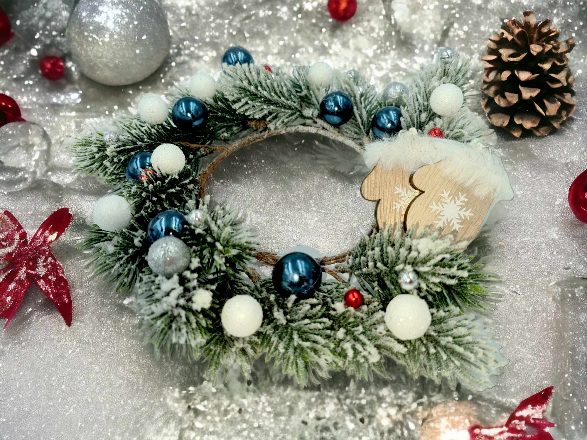 Centralnym punktem stroika są drewniane rękawiczki, które wraz z delikatnymi bombkami tworzą harmonijną kompozycję, dodającą zarówno uroku, jak i nowoczesnego akcentu do świątecznego wystroju. Drewno nadaje stroikowi naturalnego charakteru, a jednocześnie wprowadza elegancję i ciepło.